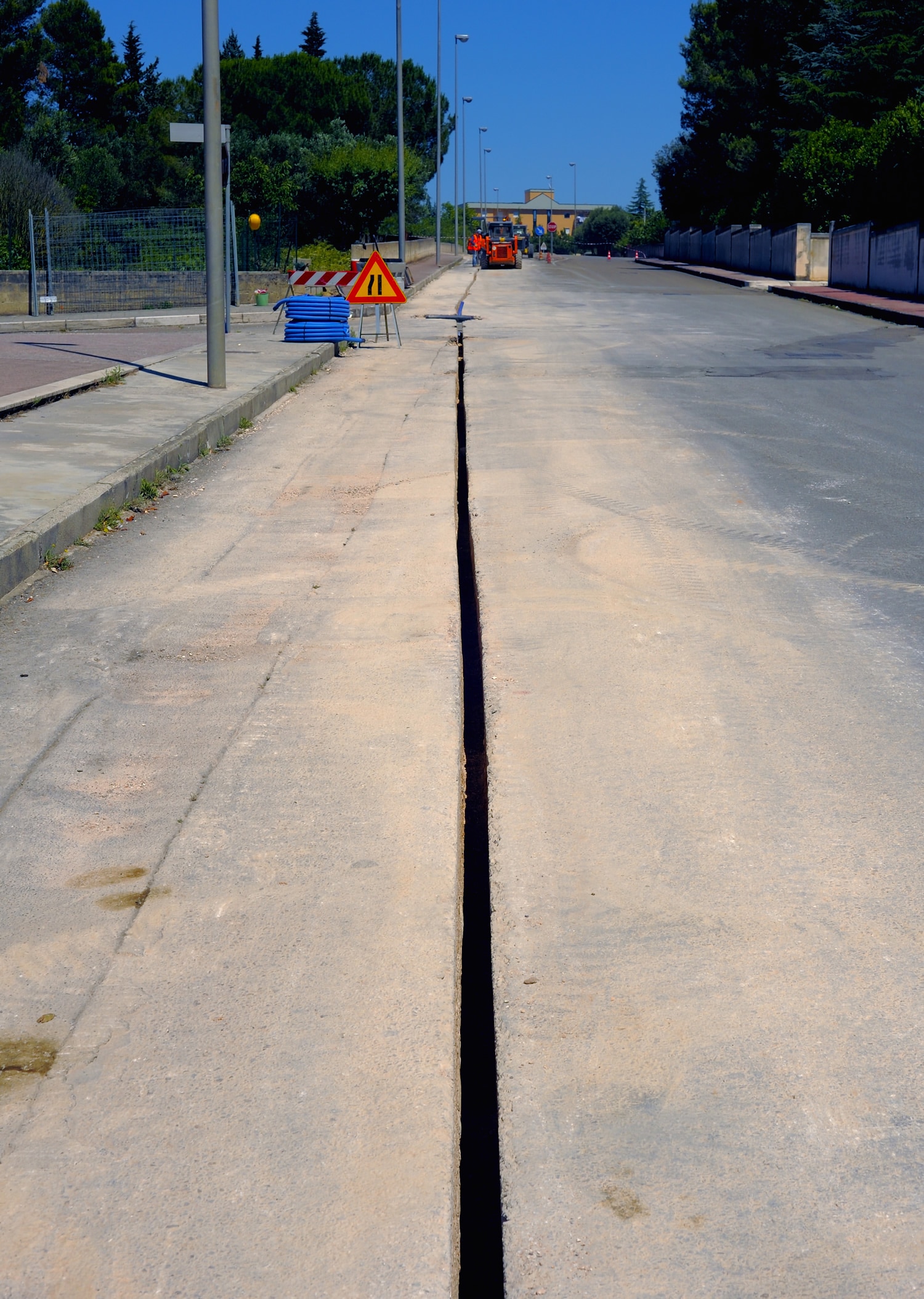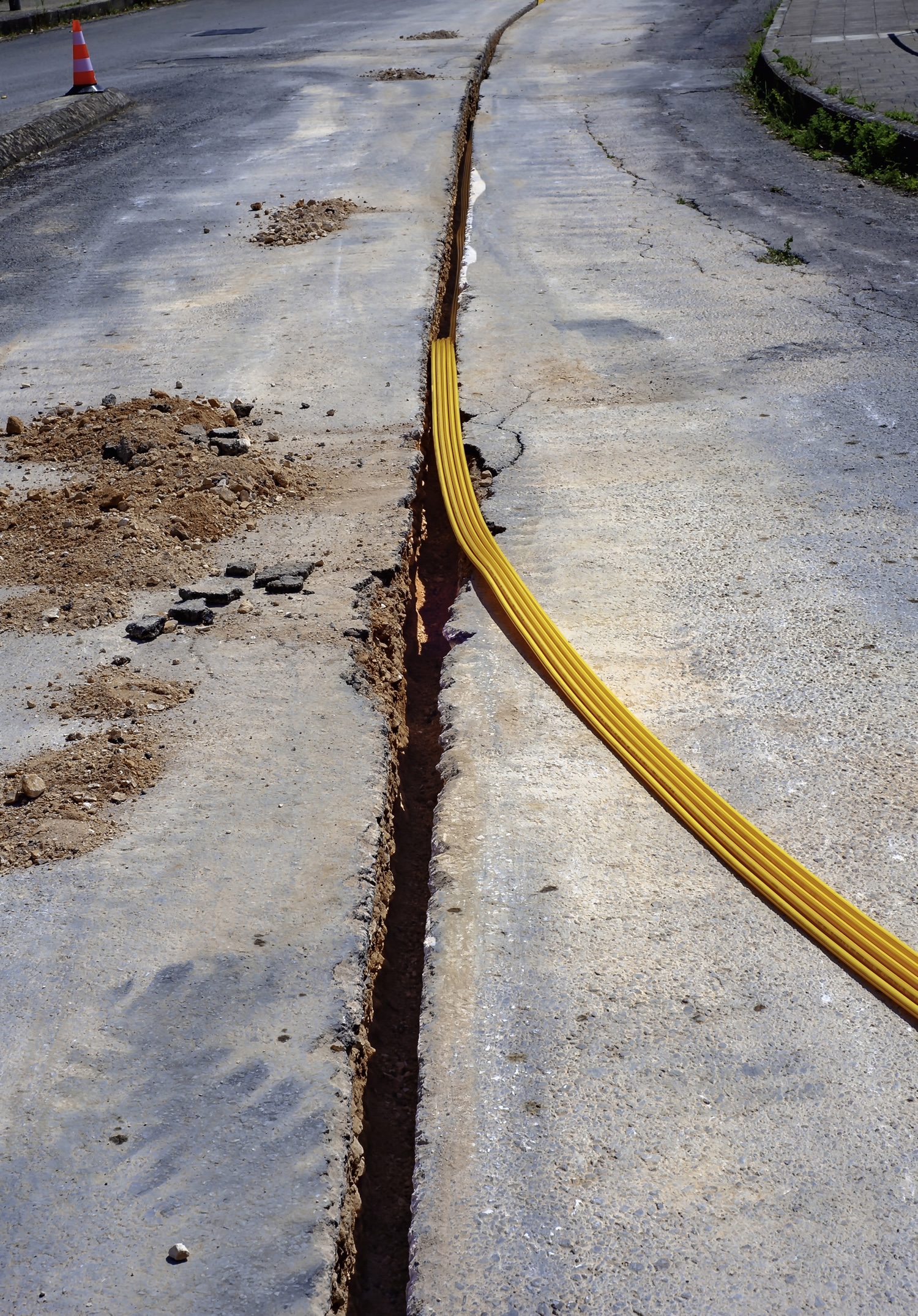 Instead of laboriously digging up the roads with an excavator, micro-trenching simply involves cutting a narrow slot directly at the curb, allowing the micro pipes or fibre optic cables, but also other cables or pipes, to be laid. The name is derived from the English words „micro“ and „trenching“, which in English means something like „tiny trench“. So the name already tells you what kind of technology is involved.